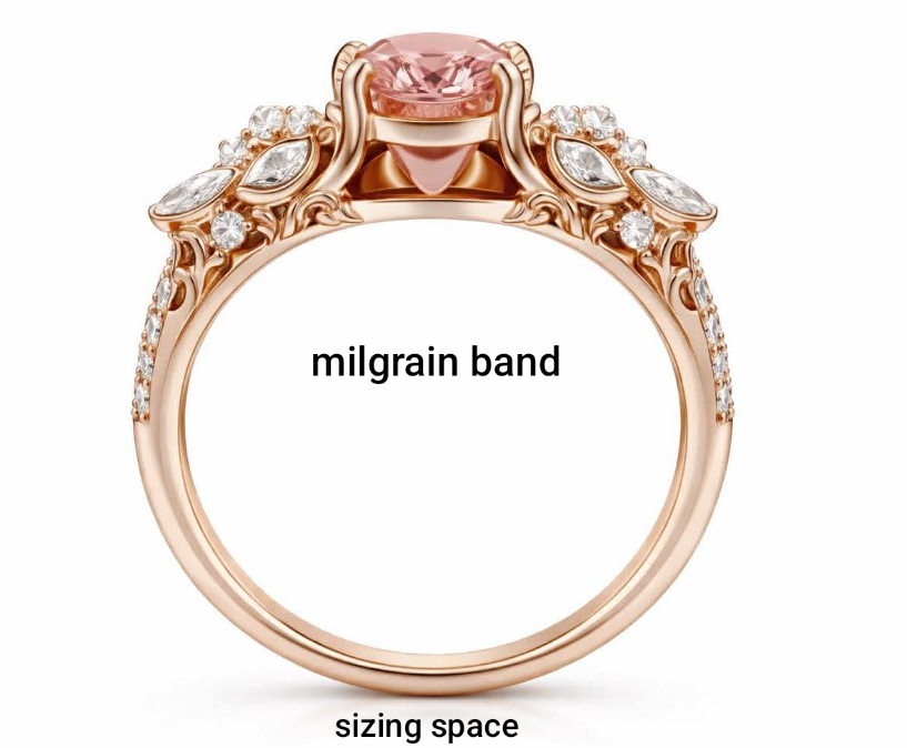 Keep approximately 1/4 of the shank plain and the rest is with milgrains for future resizing