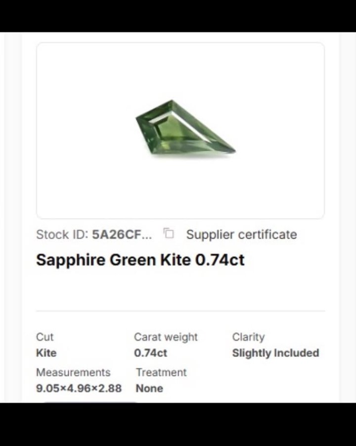 Stone: 1 pc .74ct(9.05×4.96×2.88) Kite Cut center Gemstone and 3pcs .03ct Pear cut, 6pcs .01ct