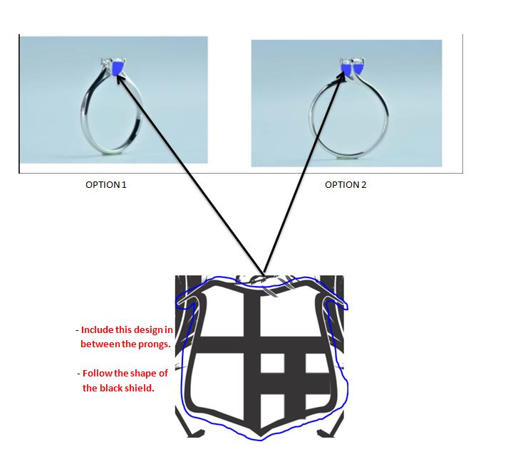 Engagement ring set with 1ct round brilliant cut white sapphire (with shield in between prongs)