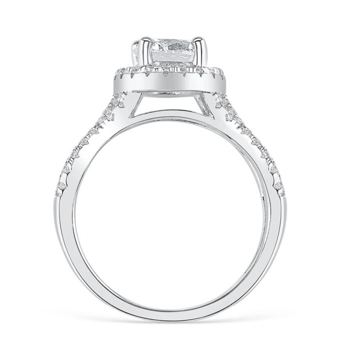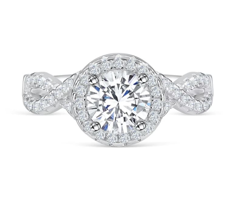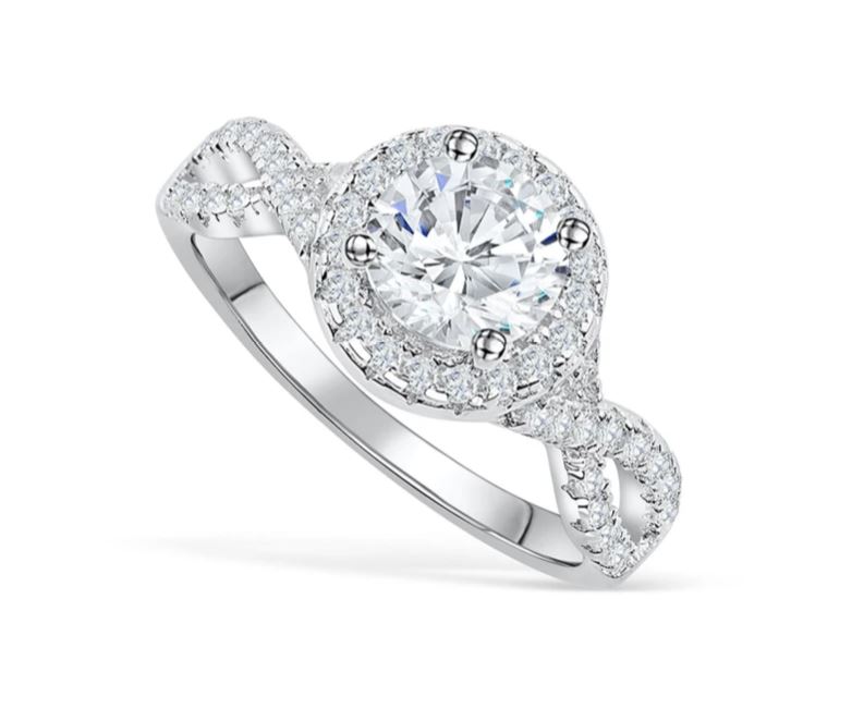 Features a 1.5ct round brilliant cut center stone with 43pcs 0.01ct each halo and side accent stones.