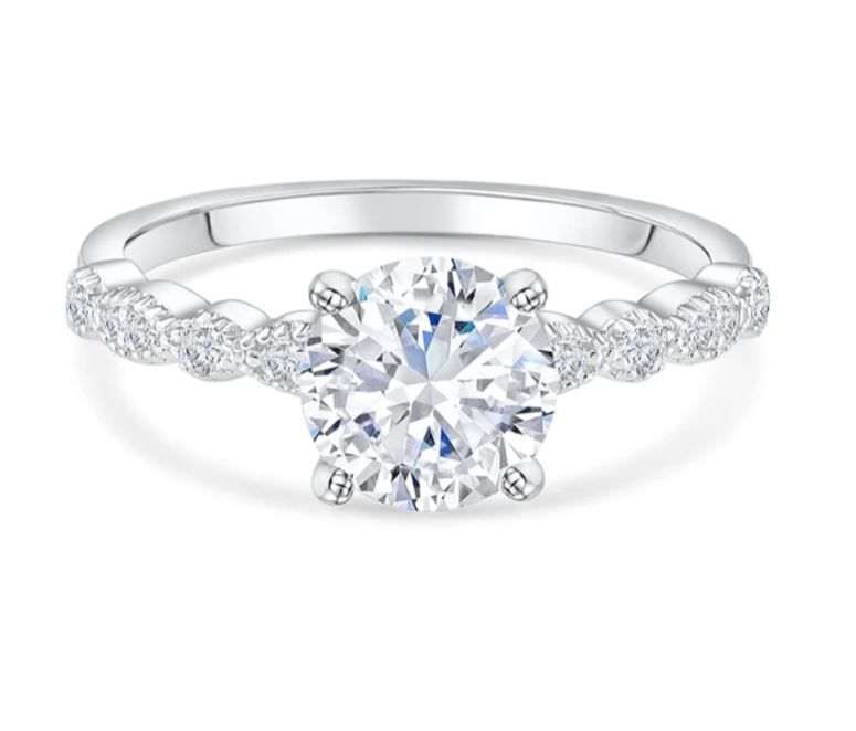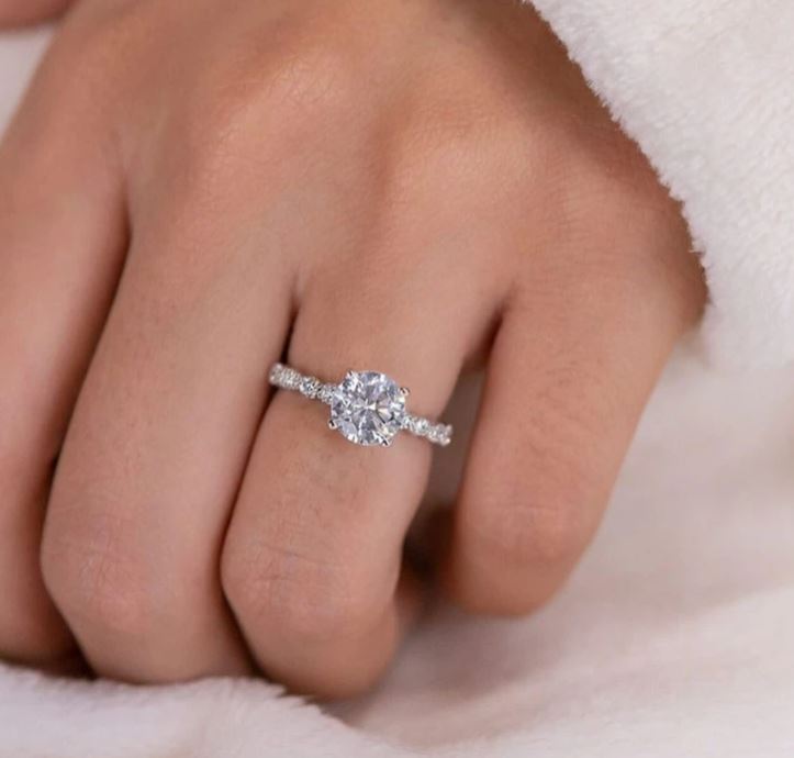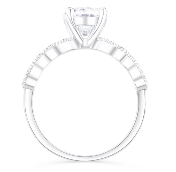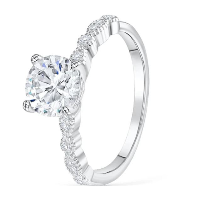 Features 1.50ct round brilliant cut center stone 0.02ct each round brilliant cut accent stones in vintage style.