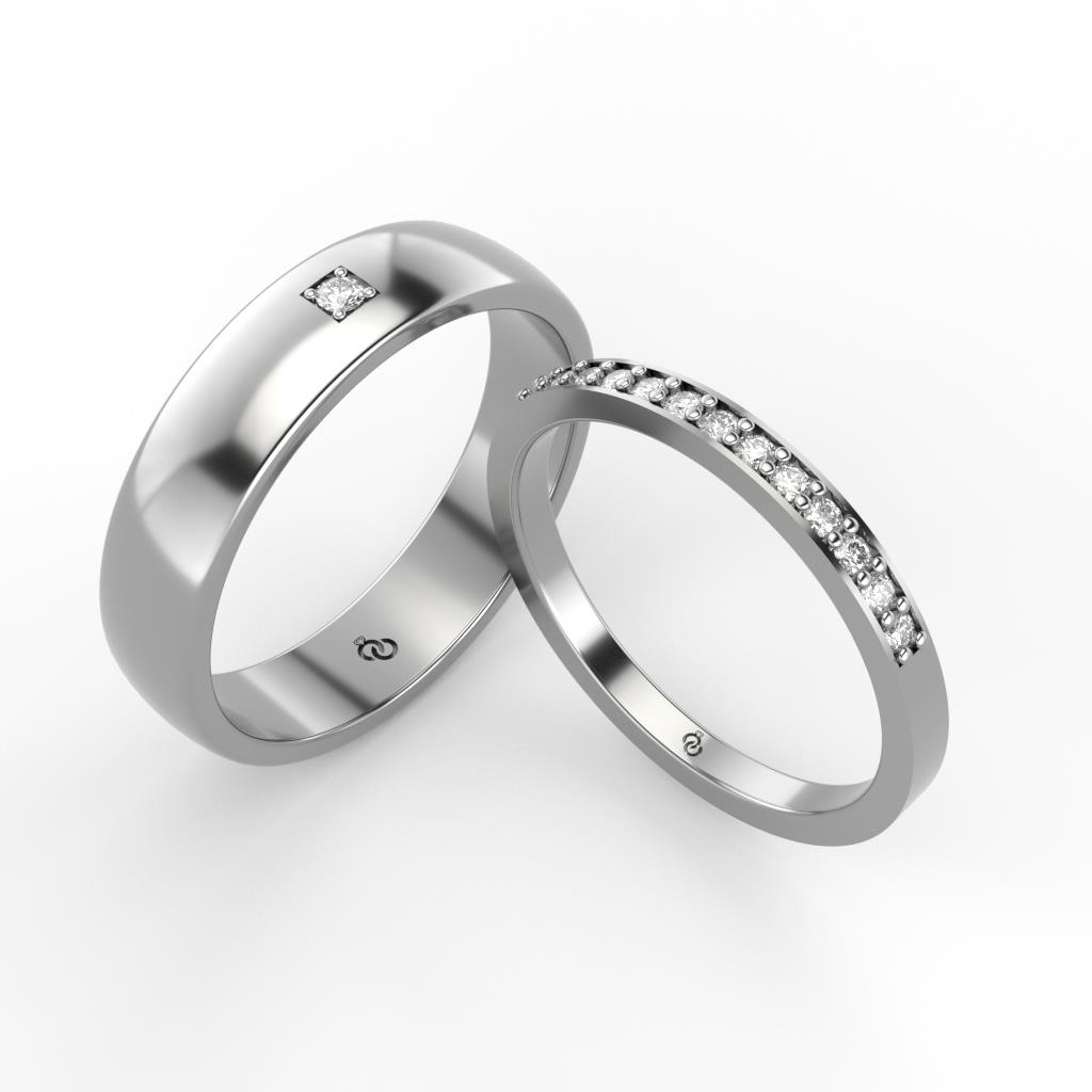 Set with 13 1.25mm brilliant stones on women’s ring and 1 1.75mm stone on matching men’s ring; 2mm/5mm