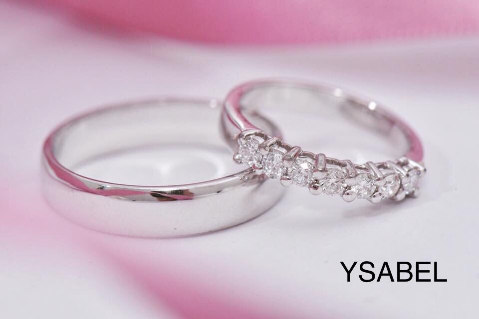Couple ring- 7pcs 0.10ct (3mm) round brilliant cut stones each on ladies’ band and classic plain men’s band.